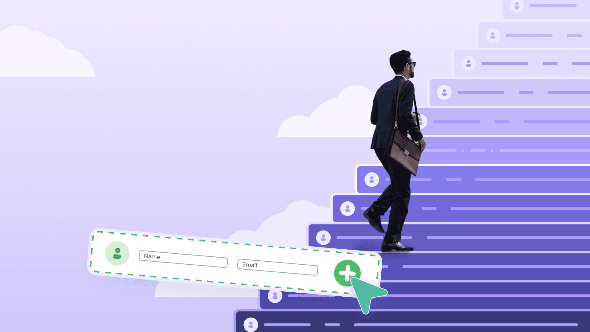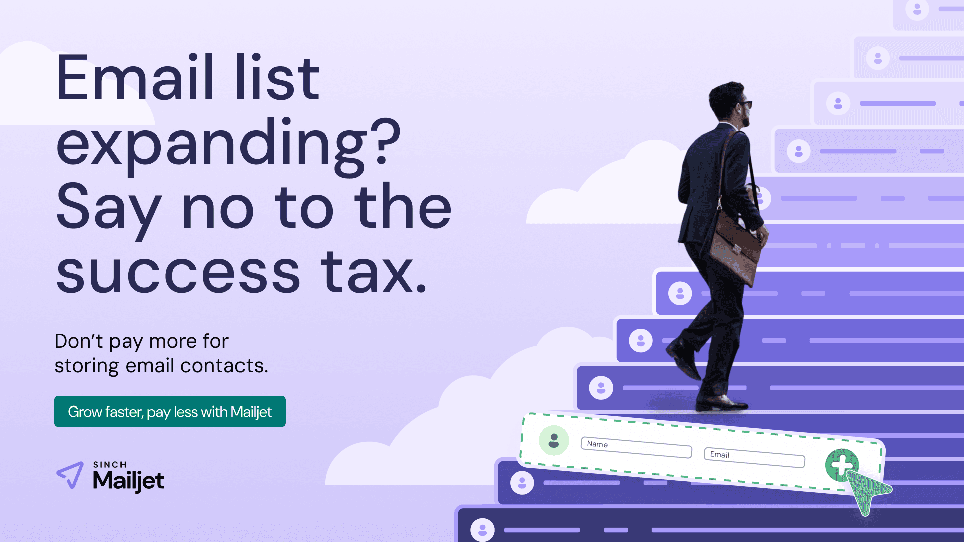 Ad 3 — A figure climbs a staircase built from contact entries. Growth as ascent. "Grow your email list, not your costs."